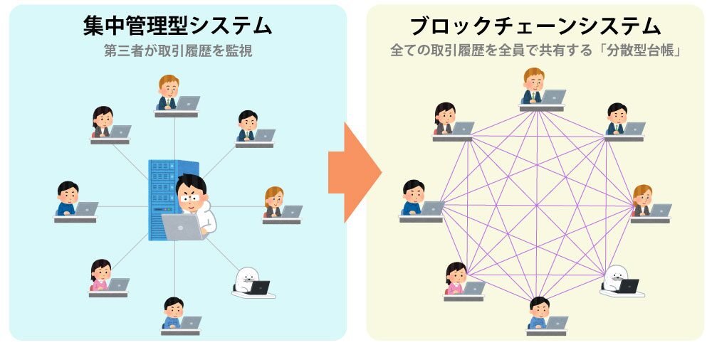 これまでの世界では、銀行や役所といった中央の管理者がいなければ、信頼できる取引は難しかったです。