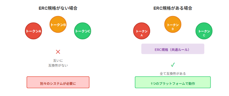 同じように、イーサリアムもNFTや暗号資産など異なる種類のトークンが、ERC規格という統一的なルールに従うことで、同じプラットフォーム上で動くことができます。