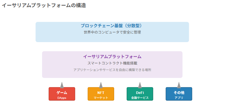 イーサリアムはお金ではなく、NFTやDeFiなど様々なアプリが動く「プラットフォーム」です。