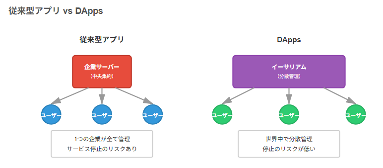 従来のアプリは企業による中央管理ですが、DAppsはブロックチェーン技術により分散管理される仕組みです。