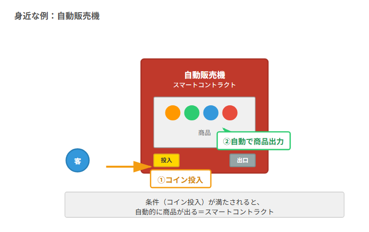 たとえば、自動販売機のように、代金を支払ったら自動的に商品が自分のものになる取引を、仲介者なく実行できるのが特徴です。