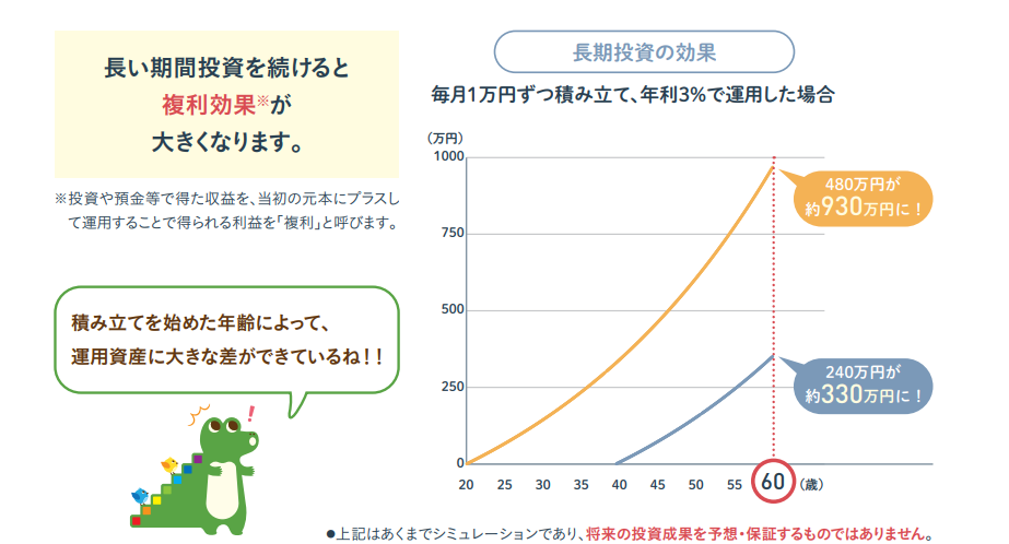 早く始めた分だけ複利効果を長く受けられるので、迷っている時間がもったいないですね。