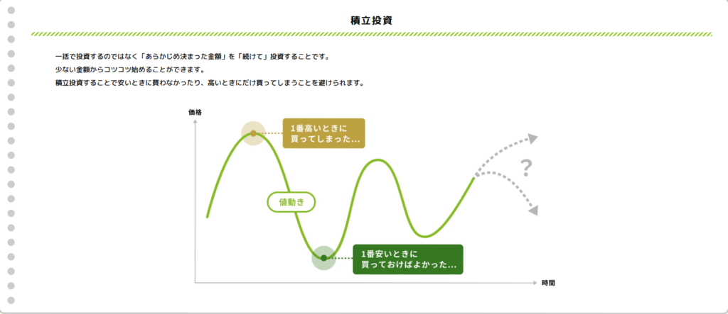 | 値動きに不安を感じる😰 | 投資信託でコツコツ積み立て |