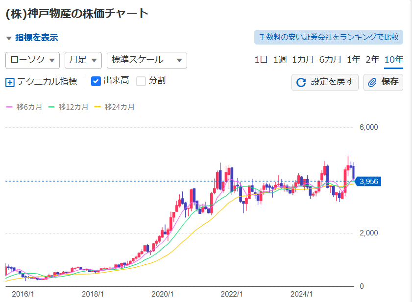 たとえば、業務スーパーを運営する神戸物産は、2016年に約327円だった株価が10年で10倍以上に成長しました。